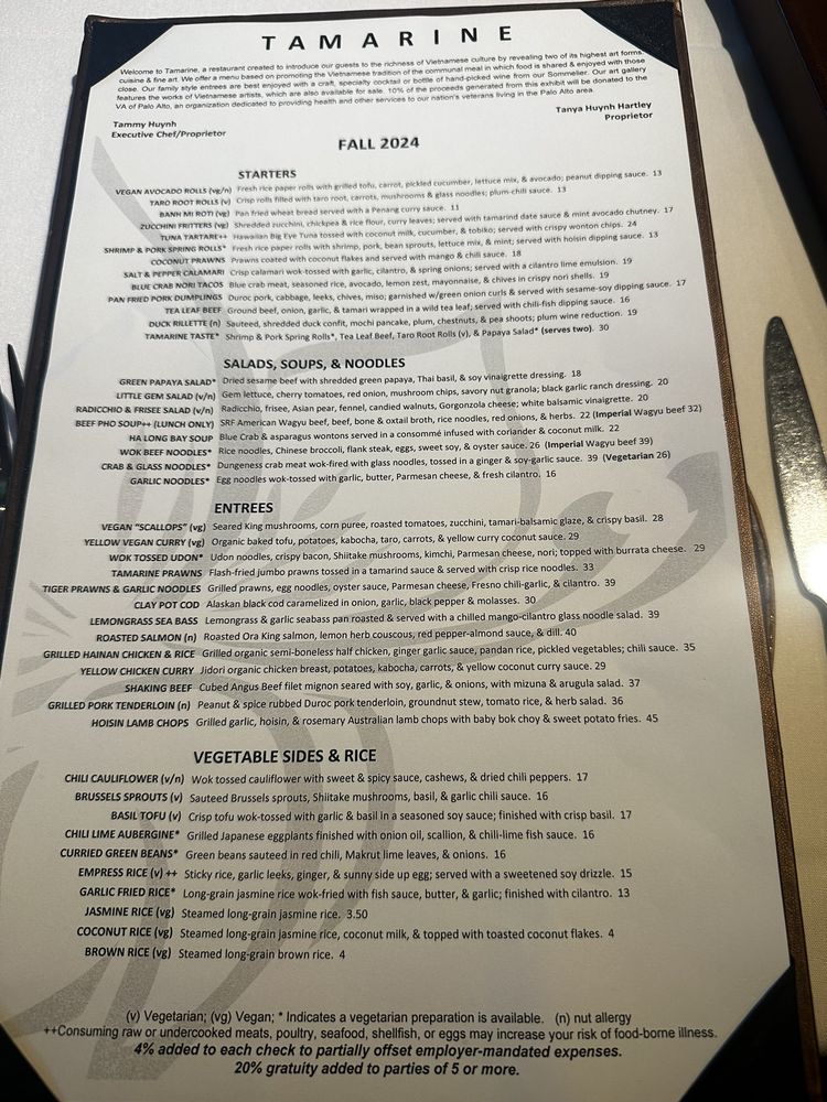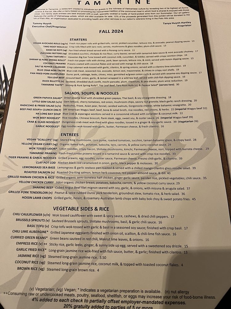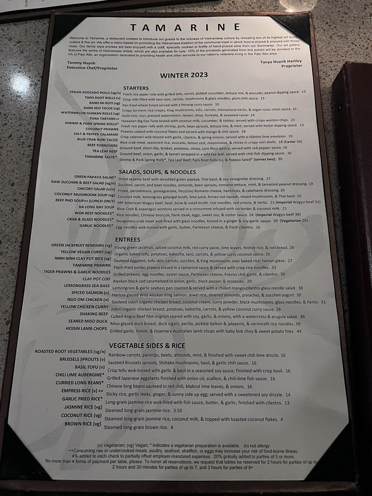 Tamarine Restaurant in Palo Alto, CA offers a Vietnamese menu with a range of options for various dietary preferences like pescatarian and vegan. The establishment boasts a classy, upscale ambiance perfect for groups or a dinner date. The menu includes unique dishes like Ha Long Bay Soup and Lemongrass Sea Bass, showcasing a blend of traditional Vietnamese flavors with a modern twist. The restaurant provides a full bar with happy hour specials and outdoor seating options. Customers praise the attentive service and quality of food, with standout dishes like Tiger Prawns and Hoisin Lamb Chops receiving high recommendations. If you're looking for a vibrant dining experience with delicious Vietnamese cuisine, Tamarine Restaurant is a must-visit.